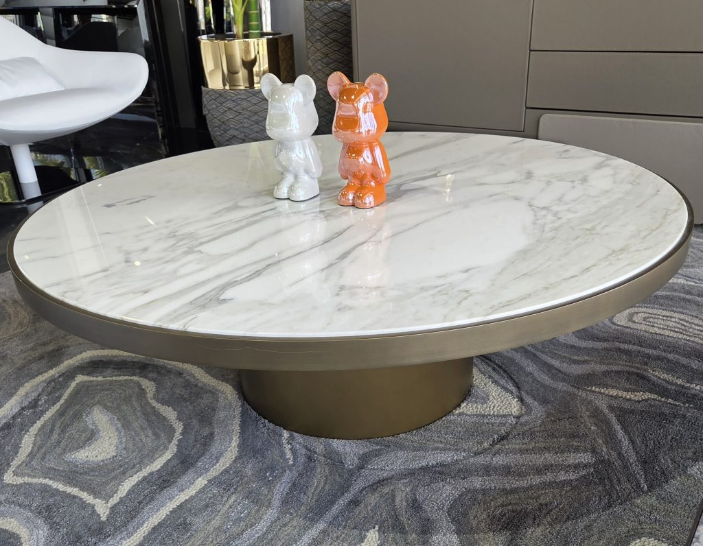 Tau Coffee Table 47″O, Marble top, Bronze Frame and Base.